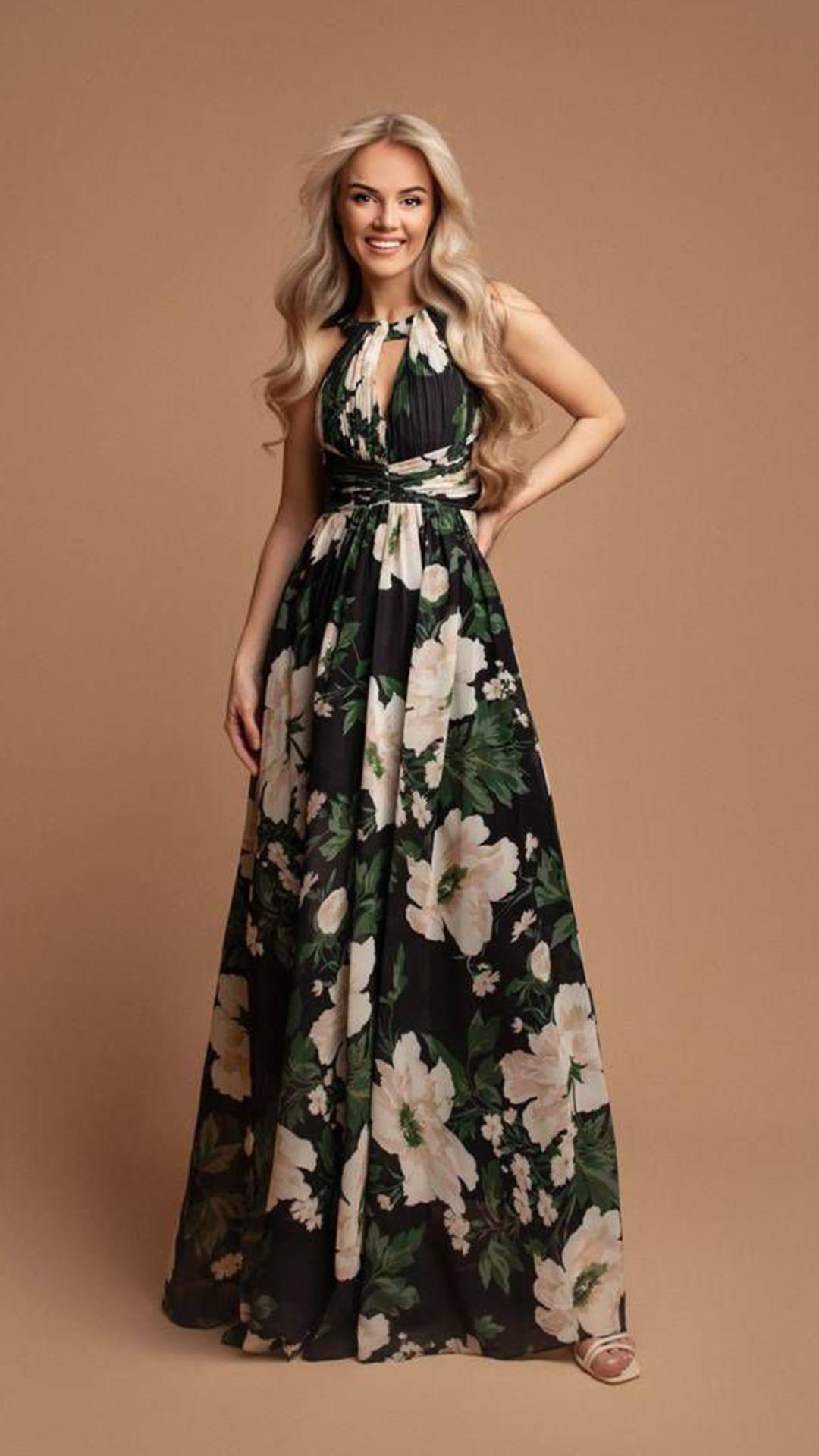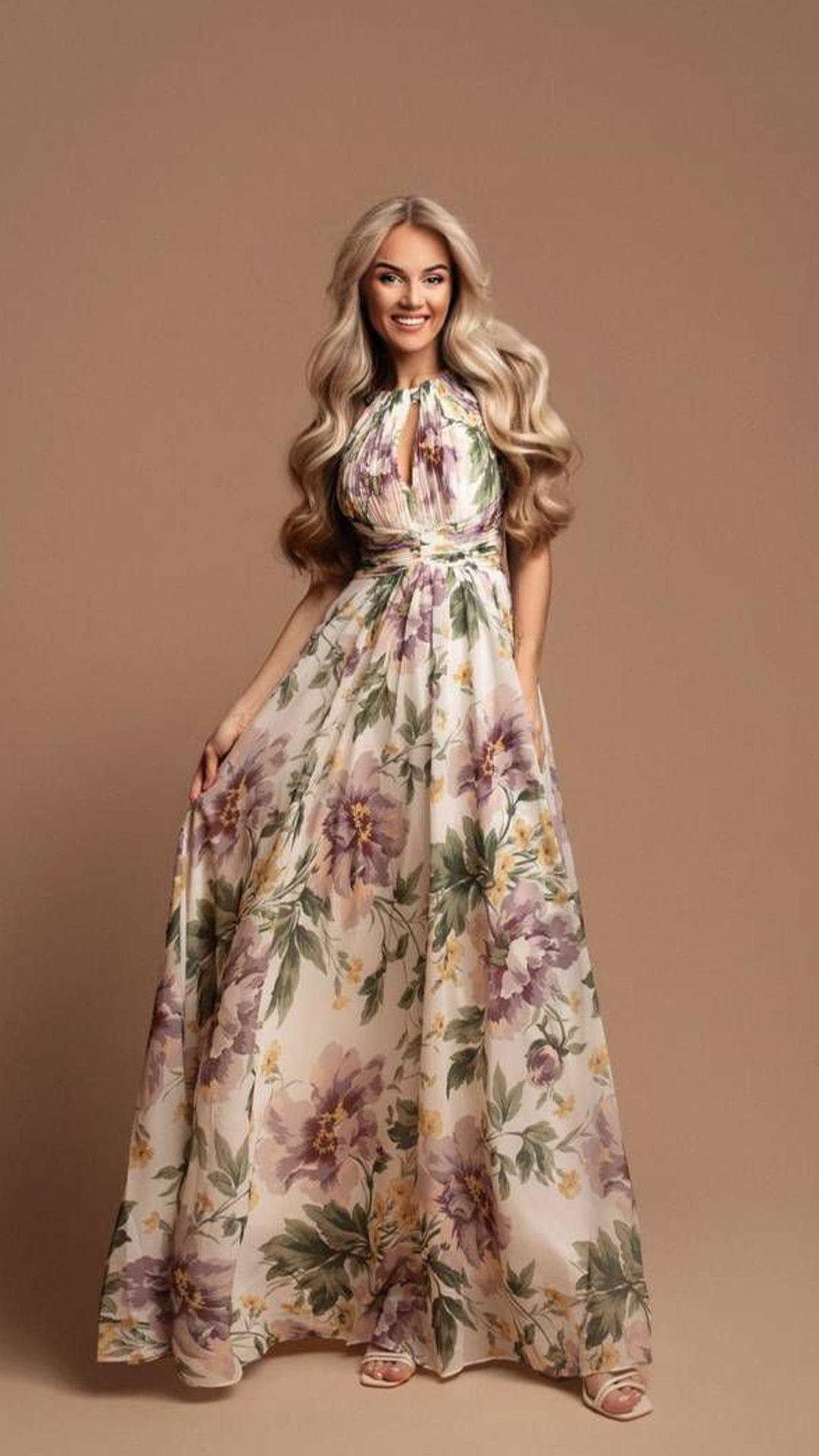 Este vestido maxi, confeccionado en seda de alta calidad, ofrece un tacto suave y una caída natural que realza la silueta femenina de manera delicada y elegante. La seda no solo aporta un brillo sutil que captura la luz de manera encantadora, sino que también es un tejido transpirable que garantiza frescura durante largas horas. La inclusión de bolsillos discretos es un detalle que marca la diferencia, proporcionando un espacio práctico para guardar pequeños objetos personales como el móvil o un pañuelo, evitando la necesidad de llevar bolso y permitiendo mayor libertad de movimientos.