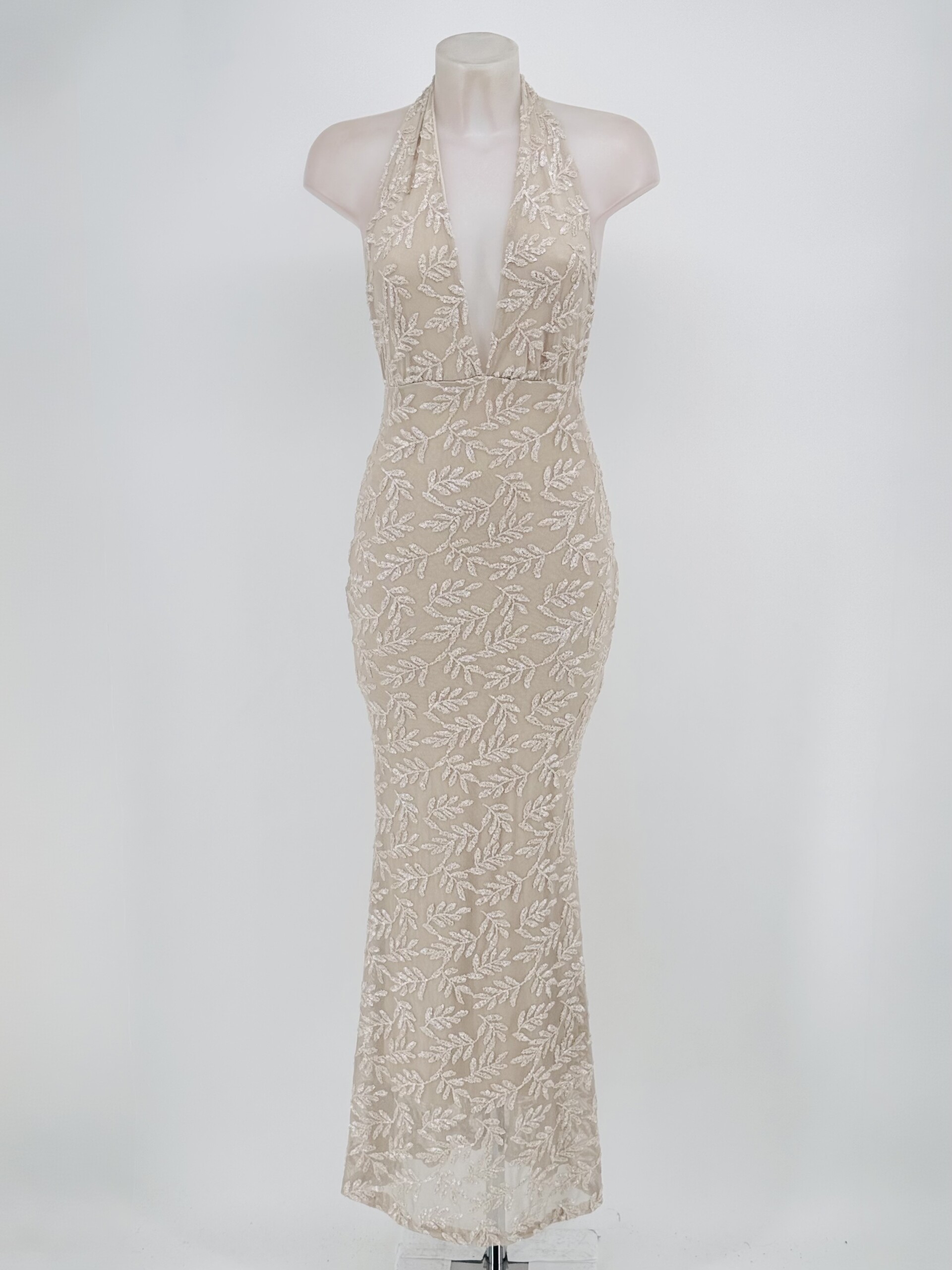 El diseño con lentejuelas y motivos florales aporta un brillo sutil y elegante que captura la luz de manera exquisita, otorgándote un acabado glamuroso que no pasa desapercibido. Las lentejuelas están cuidadosamente distribuidas para evitar la rigidez común en prendas de este tipo, lo que significa que disfrutarás de un vestido que brilla con gracia pero que también se mueve contigo con naturalidad. El detalle del cuello atado no solo añade un toque de delicadeza y feminidad, sino que también permite un ajuste personalizado, garantizando comodidad durante largas horas.