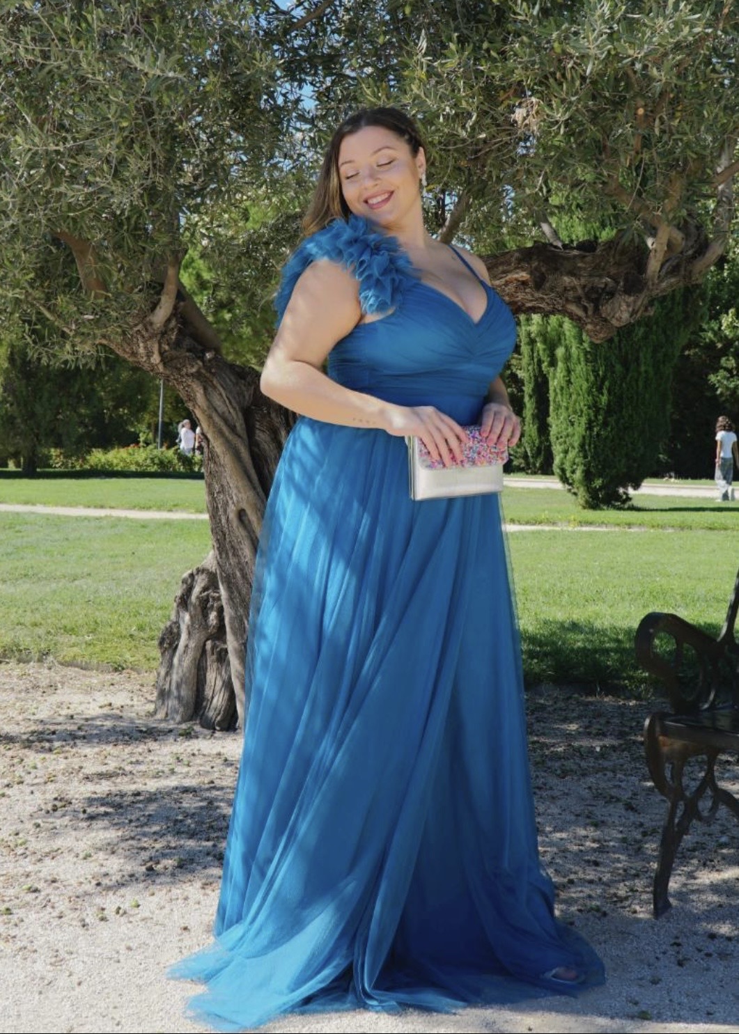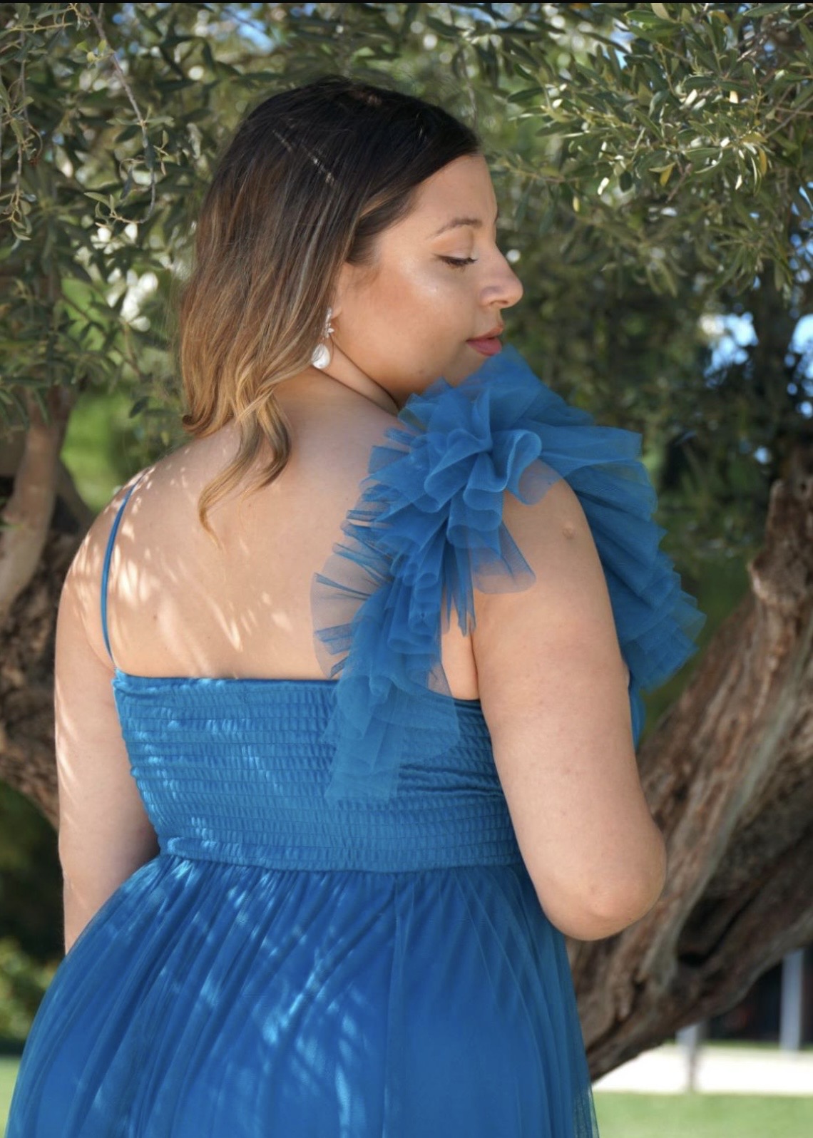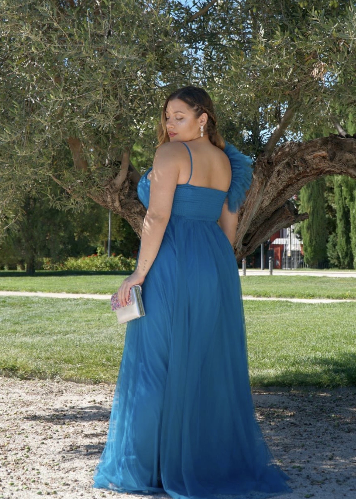 Este vestido ha sido diseñado pensando en la mujer curvy que quiere realzar sus curvas de manera natural y armoniosa. La abertura en el hombro no solo añade un toque moderno y sensual, sino que también permite una mayor libertad de movimiento, evitando la sensación de rigidez que pueden provocar otros vestidos de gala. El tejido de tul, ligero y delicado, aporta un efecto visual etéreo que contribuye a estilizar la figura, mientras que su caída fluida garantiza comodidad incluso en eventos prolongados.